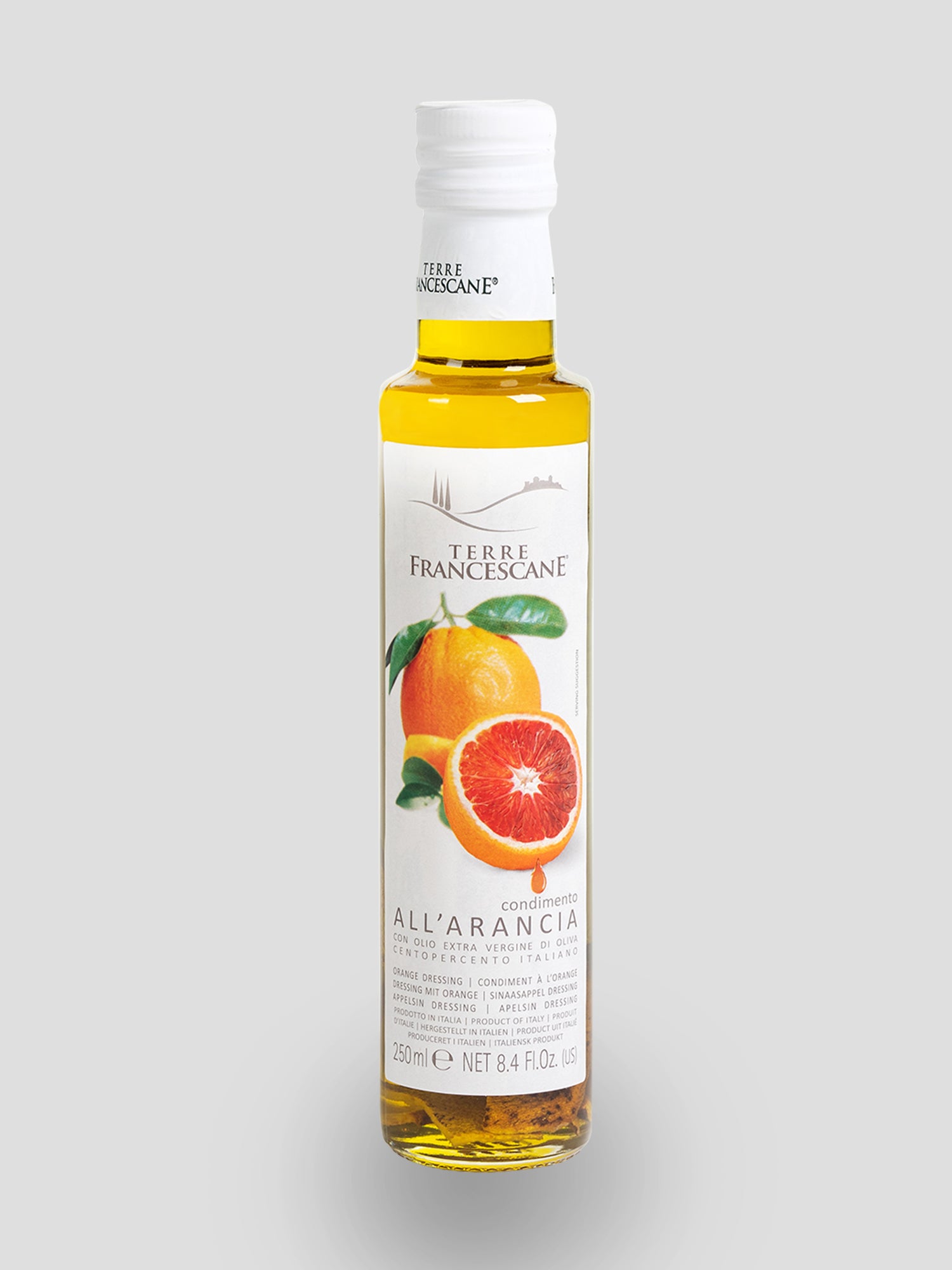 This dressing combines certified Italian extra virgin olive oil with natural orange flavor and citrus peel. The infusion is done gently to capture the vibrant aroma and slight tartness of fresh orange zest.